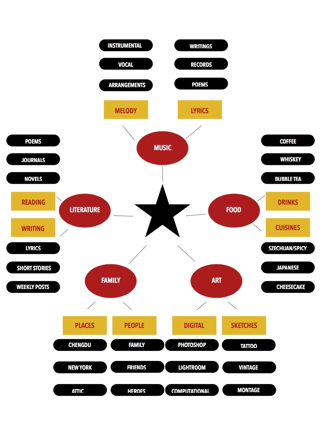 A map of Smady. A remake of her input map, using some of my favorite fonts from her typography designs, with my doodles representing the input she gets from life.